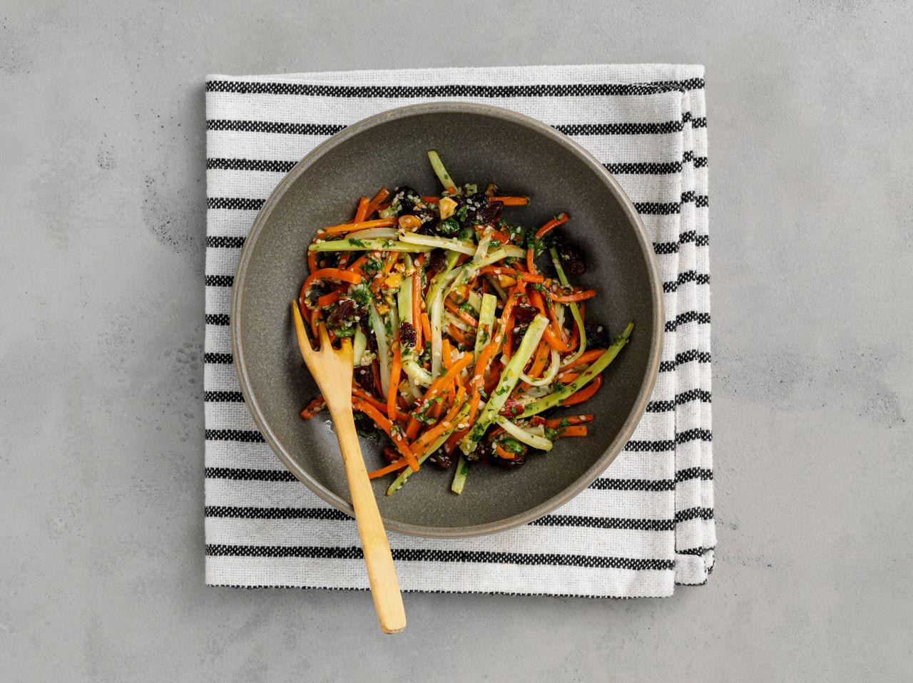 - In a large mixing bowl, combine the sautéed carrots and zucchini with finely chopped fresh cilantro, fresh parsley, toasted and chopped almonds, raisins, sesame seeds, and pomegranate seeds.