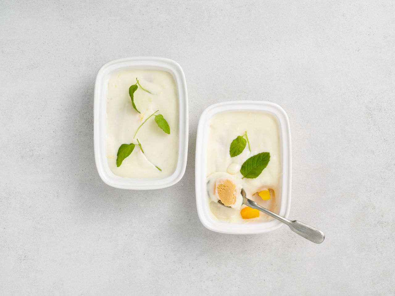- Add vanilla custard, and garnish with nuts, coconut, and mint.