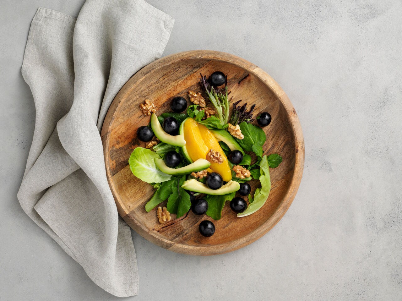 - Add the sliced mango, mixed nuts and black grapes to the rocket.
