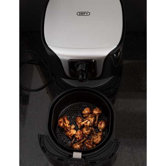 Cut each chicken wing in three pieces, by carefully cutting through the cartilage at each joint. Use the very tip of the chicken wing for stock or another use. Prepare the lollipops by carefully scraping the meat from the bone so that all the meat is on one side. Turn the meat inside out so that it forms a ‘lollipop’. Season well with Oryx Braai Salt. Using Defy Airfyer cook for 20-25 min at 160˚C.
