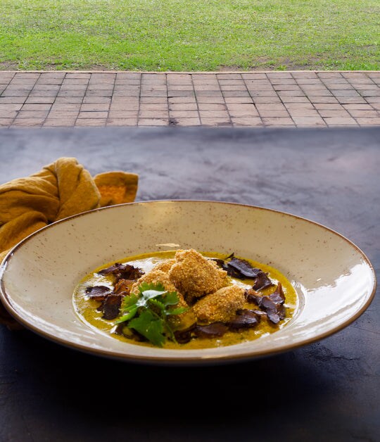 For the curried coconut sauce: heat the oil in a pan on the gas hob of the Defy Cooker. Sauté the onions and garlic together until caramelised. Add the coconut milk and then stir in the turmeric, ginger and chilli. Simmer for 5 minutes. Lastly add the coriander and simmer, covered with a lid to ensure the flavours can infuse. Season well with salt and pepper. Place the mixture into the Defy beaker and blend with the hand blender with the blending attachment until smooth. Strain through the sieve.